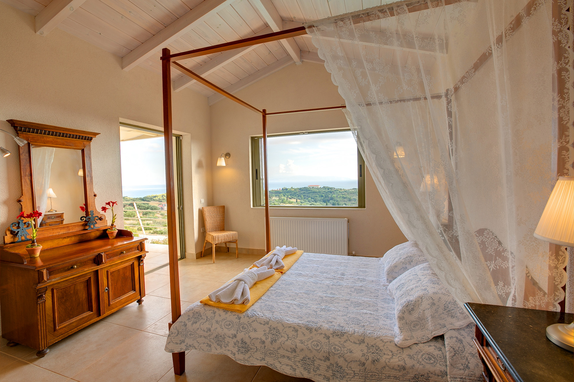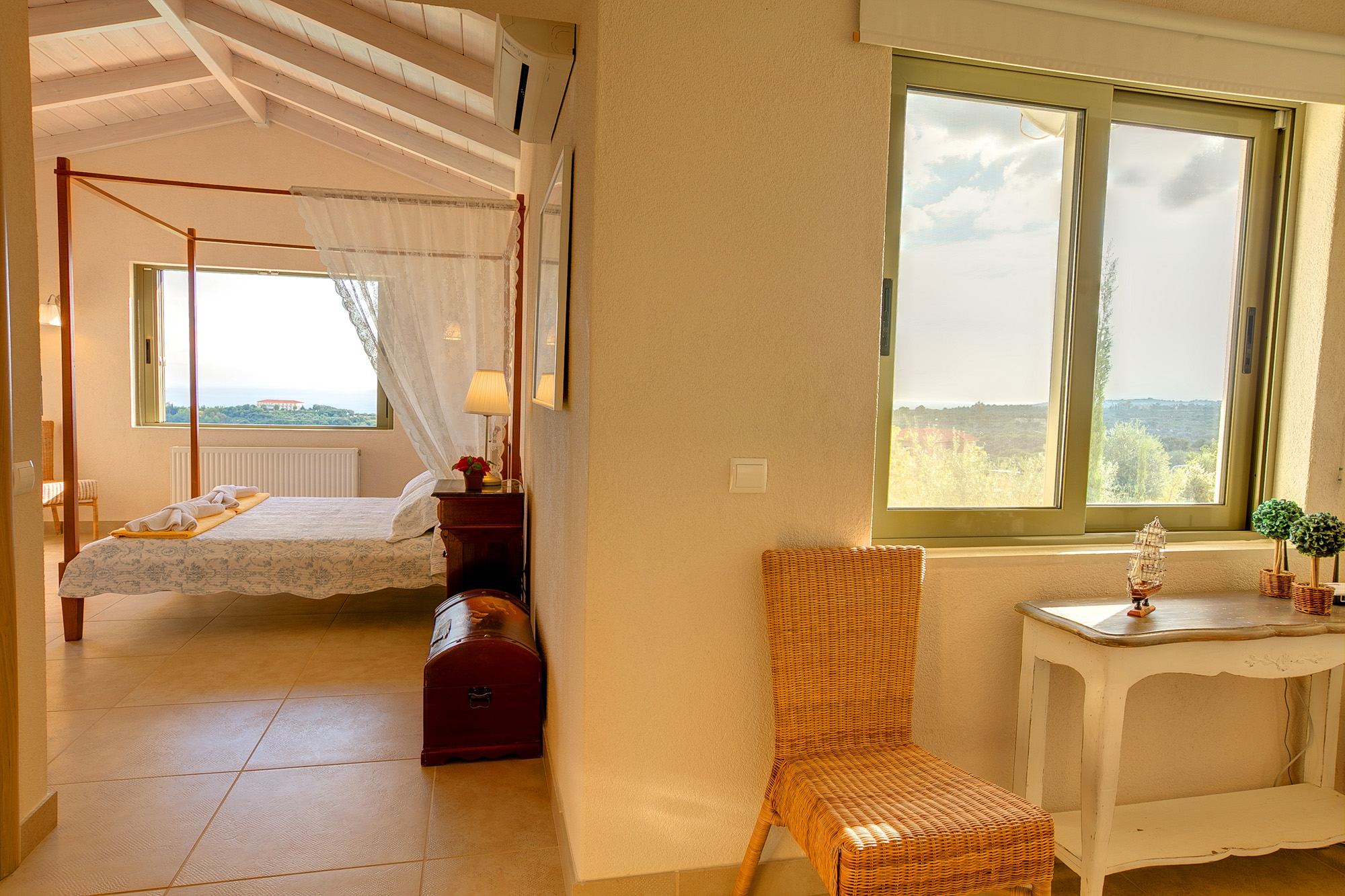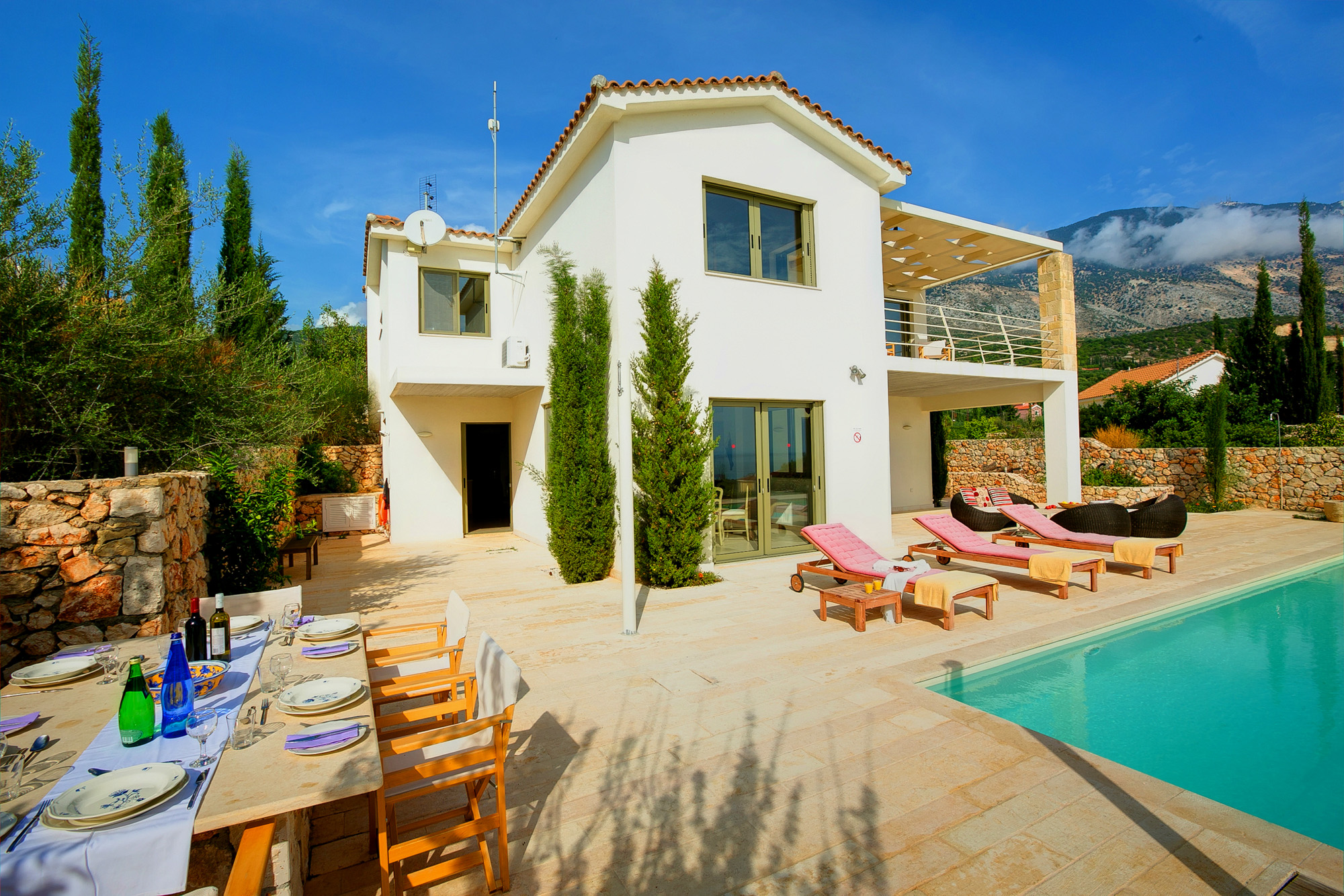 Both bedrooms are en suite and they both open onto a pergola-shaded balcony, with outdoor seating and wonderful view over the Ionian Sea and the natural surroundings.