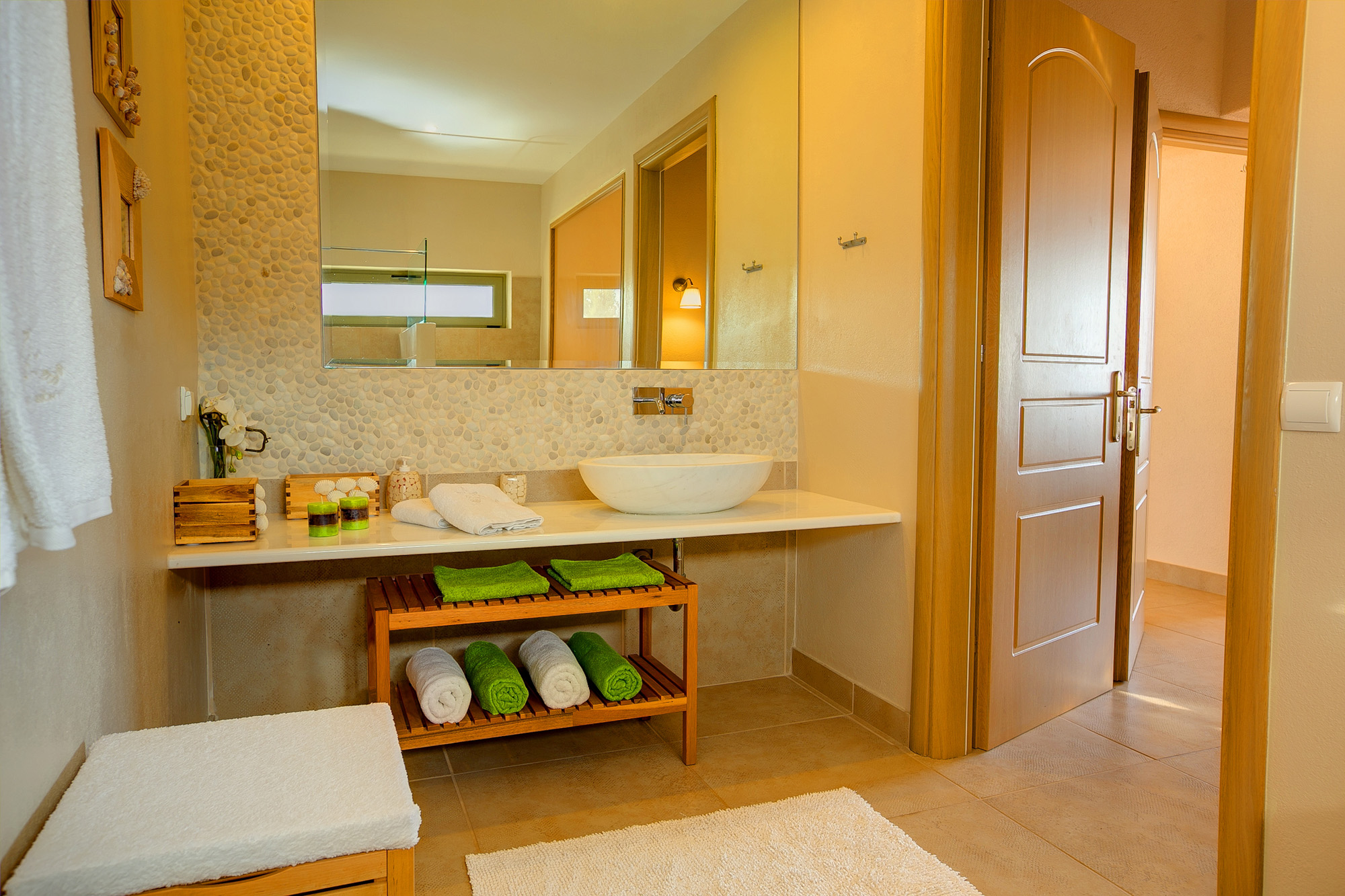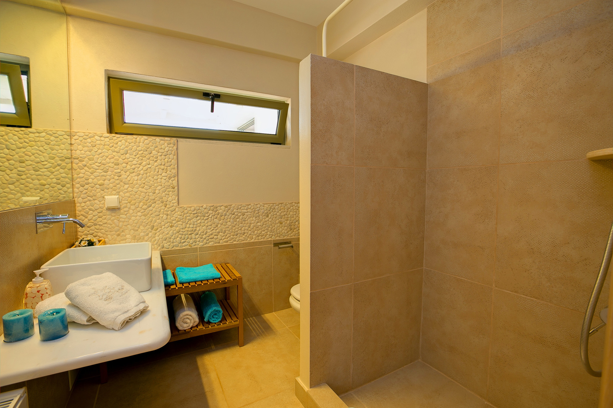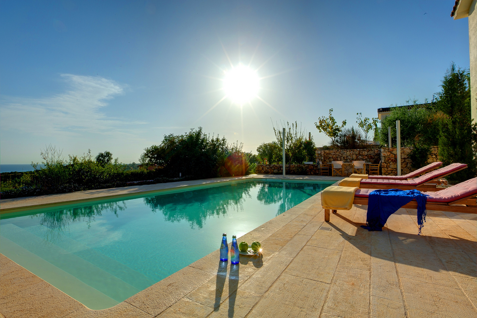 Both bedrooms are en suite and they both open onto a pergola-shaded balcony, with outdoor seating and wonderful view over the Ionian Sea and the natural surroundings.